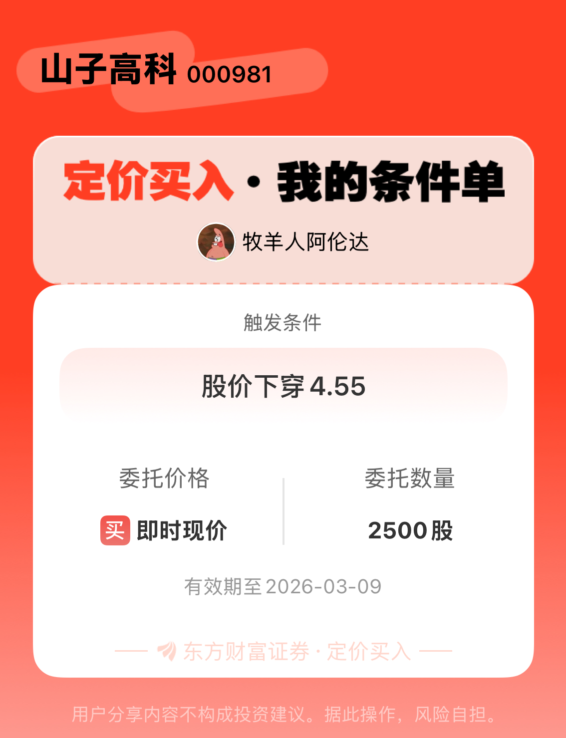 #条件单交流# #定价买入晒单# 一位股神设置了一个定价买入条件单,接下来就是见证奇迹的时刻~$山子高科(SZ000981)$