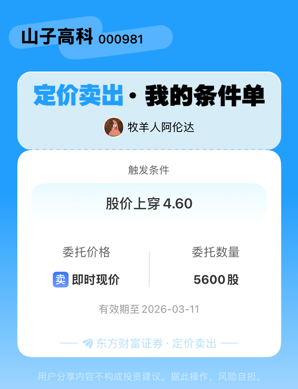 #条件单交流# #定价卖出晒单# 一位股神设置了一个定价卖出条件单,接下来就是见证奇迹的时刻~$山子高科(SZ000981)$