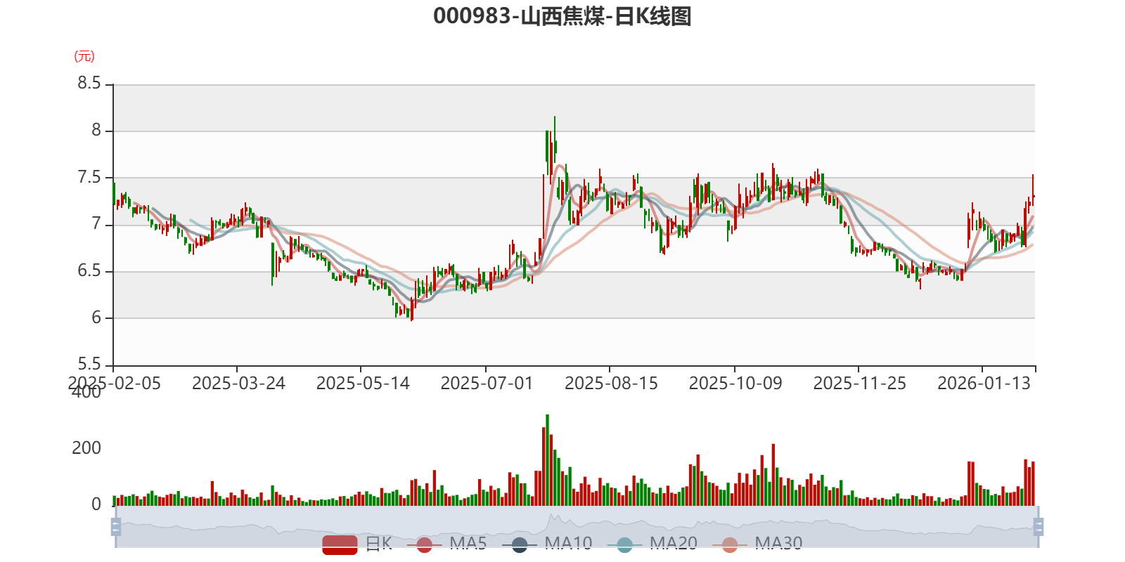 据公告,公司2025年度业绩下降的主要原因:一是由于国内煤炭市场供需呈现宽松态势,煤炭价格弱势运行,公司煤炭产品销售价格同比下降明显。同时第四季度受采掘衔接及安全监管趋严等因素影响,煤炭销量比第二、三季度有所下降,导致公司煤炭板块利润同比大幅下滑。二是公司于2024年10月23日竞拍取得兴县区块煤炭及共伴生铝土矿探矿权,2024年12月20日上缴资源价款,该项目贷款产生的利息费用全额计入当期财务费用,对公司业绩影响较大。