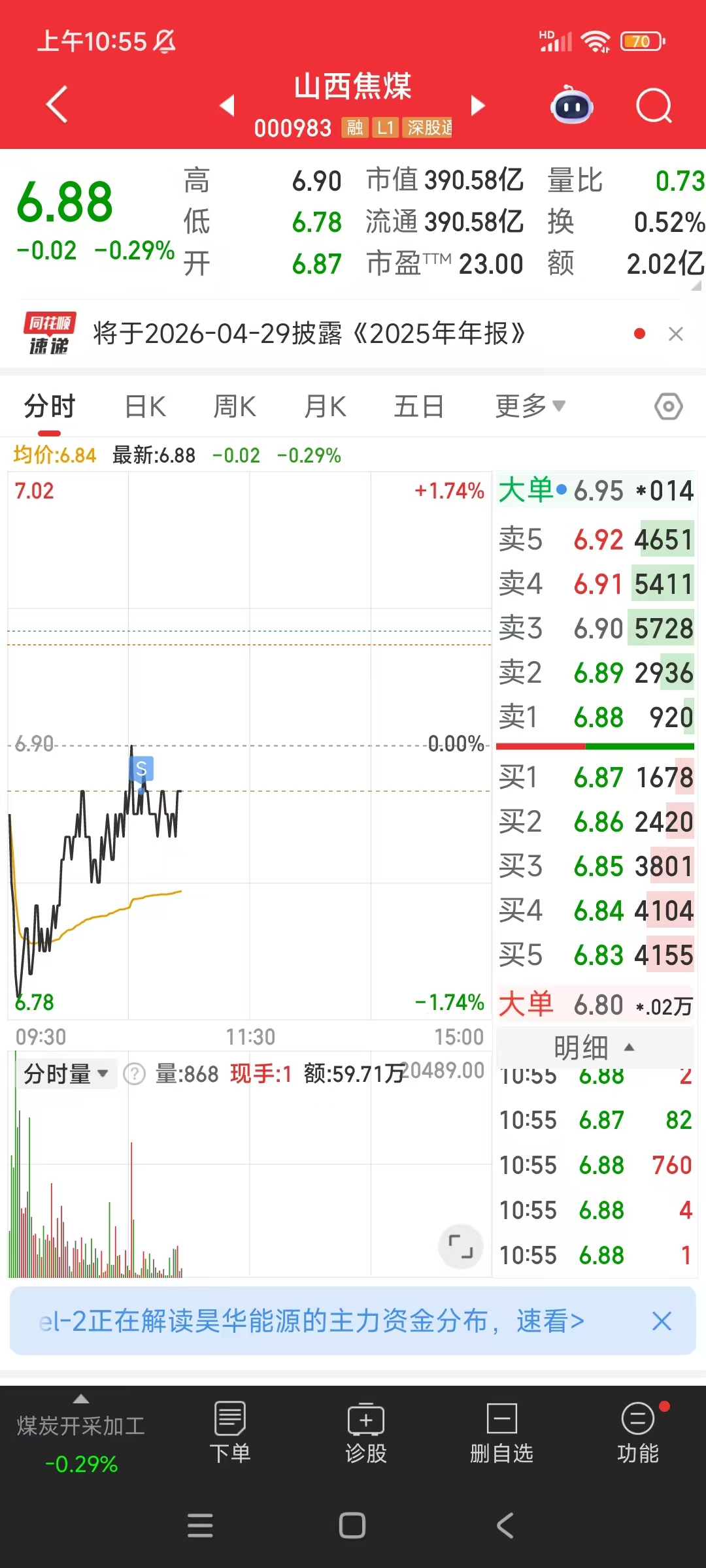 $山西焦煤(SZ000983)$ 昨天尾盘竞价买了六成仓,6.88割了一半,成本抬高到6.94了