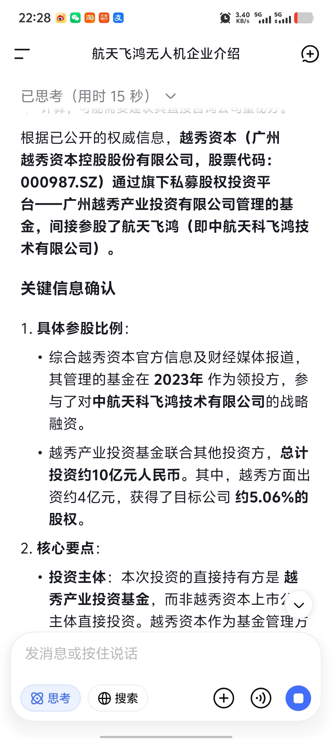 $越秀资本(SZ000987)$ 重大利好!隐形军工股!其2023年已参股航天科技集团旗下航天飞鸿4.56%的股份,已知在军事领域飞鸿系列产品生产与运用上已经很成熟了,民用领域产品矩阵也很丰富,已知这个信息的群友们点个赞。