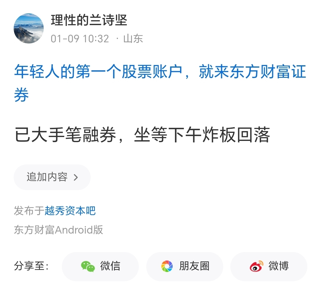 温馨提示: 1.根据《证券法》规定,禁止编造、传播虚假信息或者误导性信息,扰乱证券市场;2.用户在本社区发表的所有资料、言论等仅代表个人观点,与本网站立场无关,不对您构成任何投资建议。用户应基于自己的独立判断,自行决定证券投资并承担相应风险。《东方财富社区管理规定》