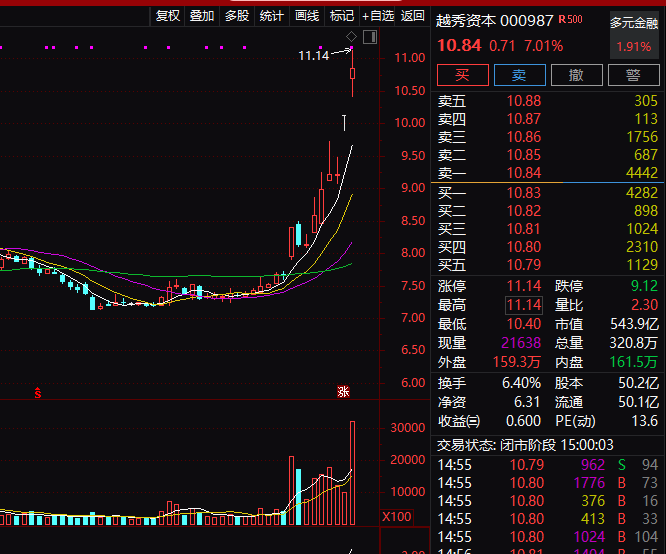 近期,越秀资本股价走势强劲,1月12日再度大涨7.01%,收报10.84元/股,总市值为544亿元。