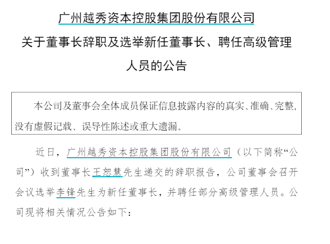 1月12日晚间,总资产超2100亿元的资本集团越秀资本披露,董事长王恕慧辞职,公司选举李锋为新任董事长,并聘任部分高管。