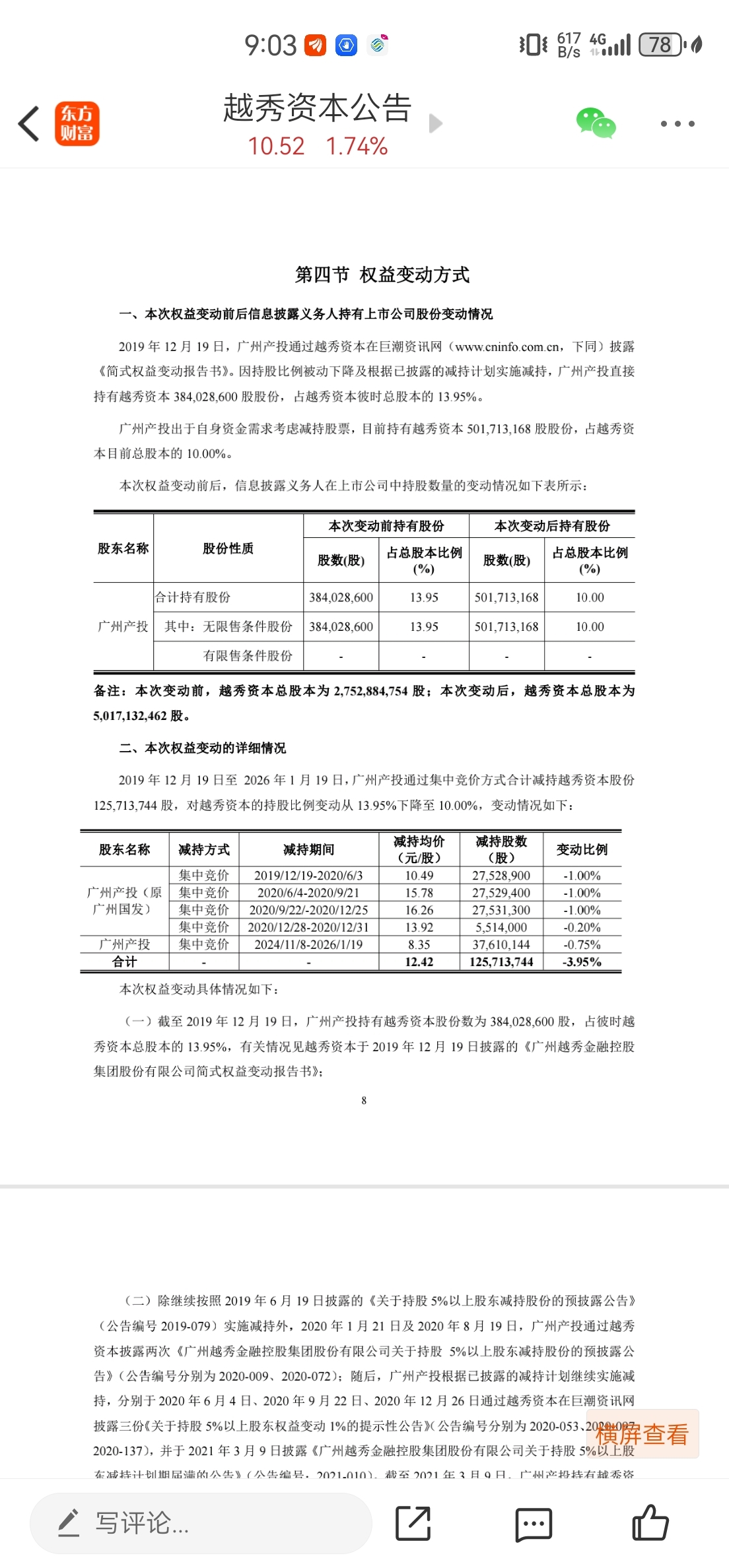 $越秀资本(SZ000987)$ 搞了半天二股东在减持,终于坚持完毕出公告了,减持的成本8.5,估计7块左右的时候出了一半多,这几天大涨的时候出了一小半,后面再拉没这货的阻力了。我说这段时间怎么有人一直出货。
