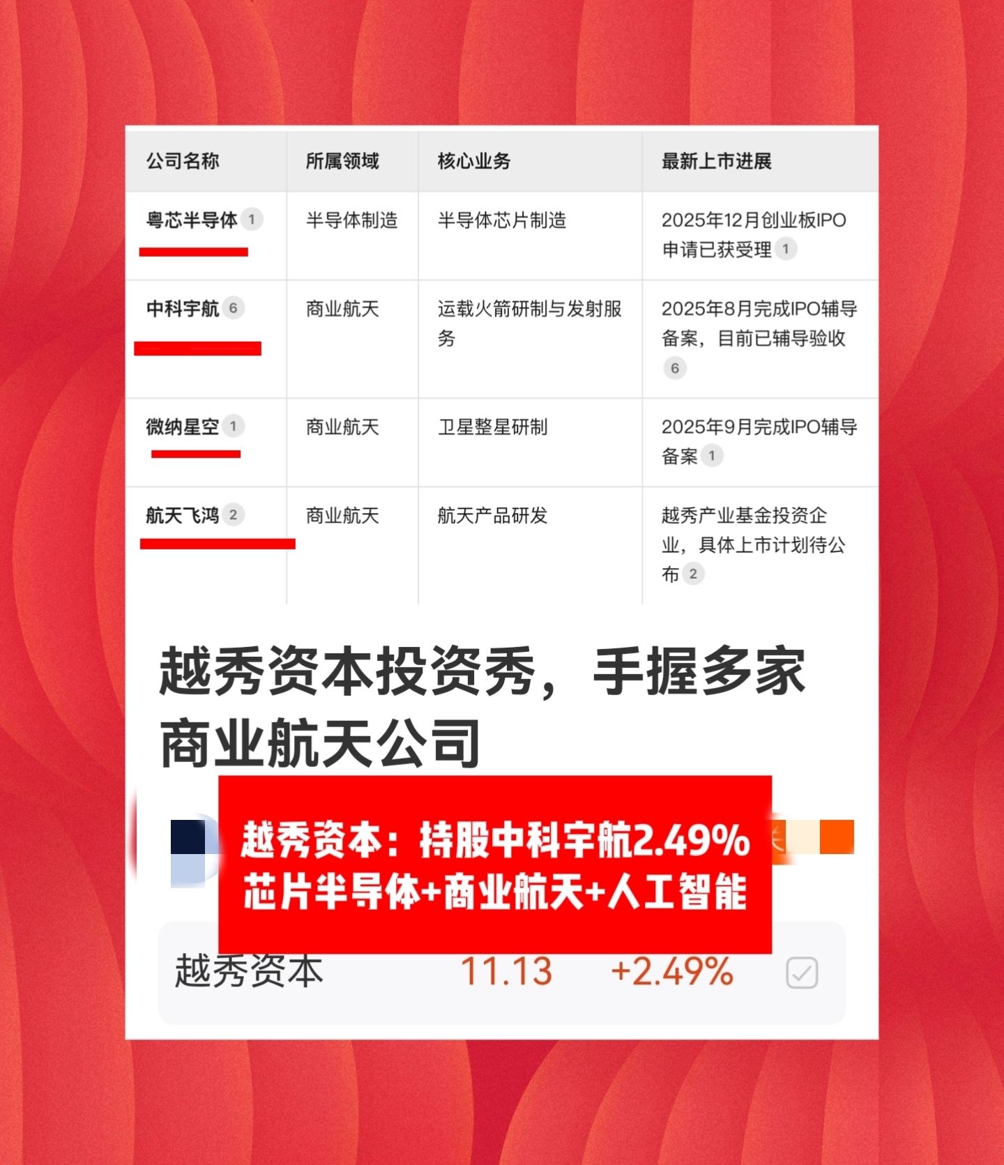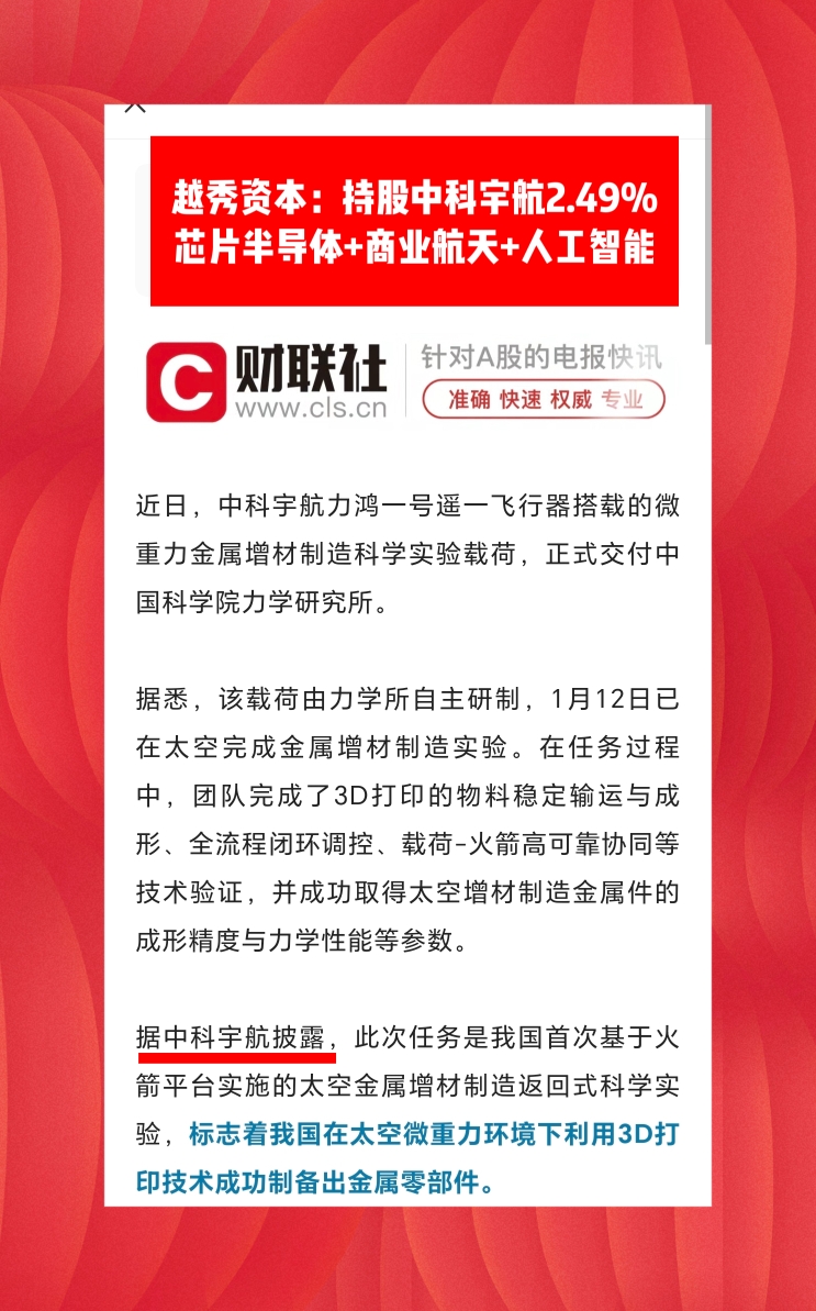 越秀资本持股中科宇航2.49%,比例最高
