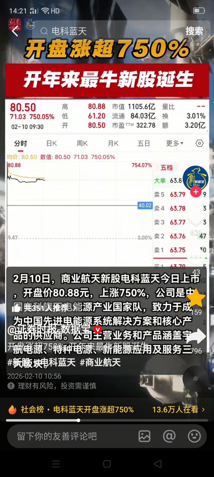 商业航天新股电科蓝天今天上市,涨得不错,涨了几倍,中科宇航、微纳星空、蓝箭航天等