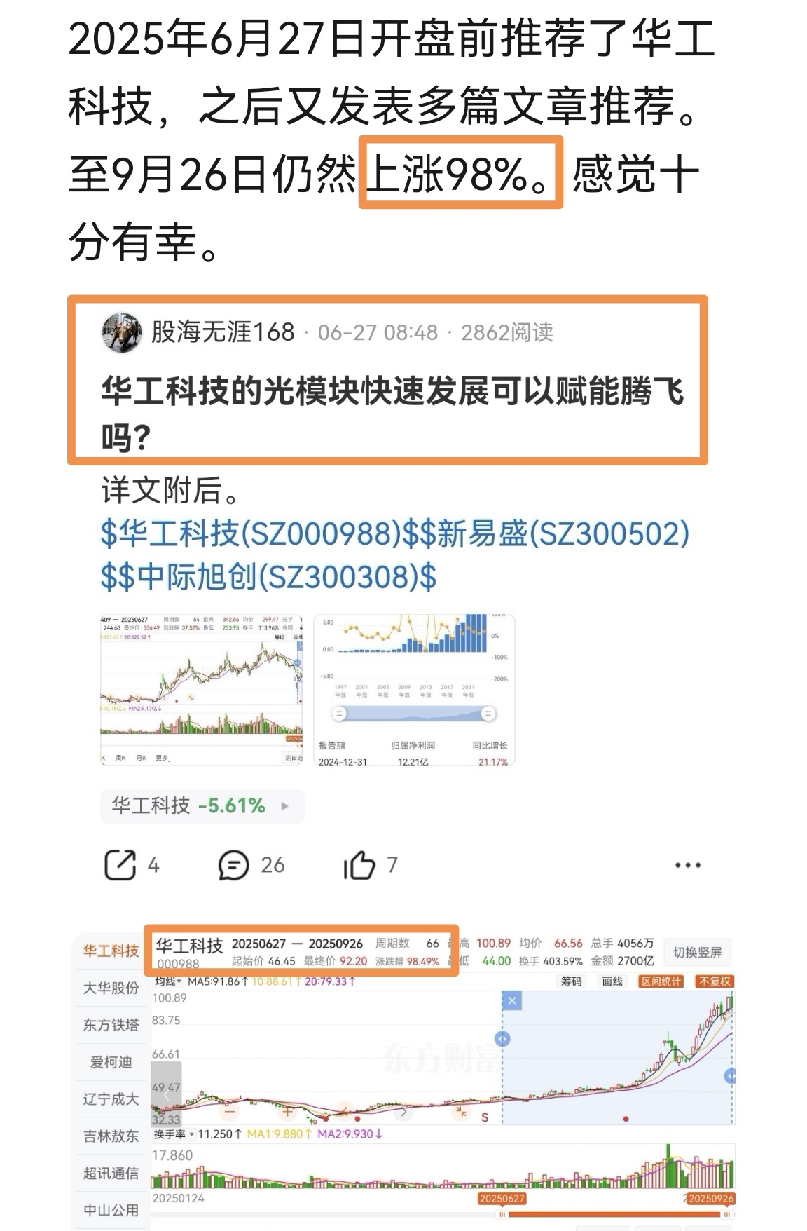 2025年6月27日开盘前推荐了华工科技,之后又发表多篇文章推荐。至9月26日仍然上涨98.49%。感觉十分有幸!