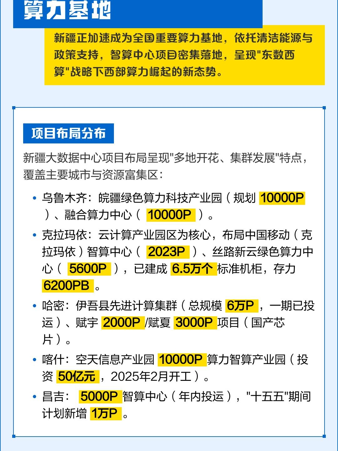 乌鲁木齐经开区皖疆产业园规划西北首个万P级智算中心,与融合算力中心形成双核驱动;克拉玛依云计算产业园区通过中国移动1.4万机柜智算中心、丝路新云5600P项目,构建全疆最大算力储备池;哈密伊吾县6万P先进计算集群(一期PUE≤1.15)以"算力换资源"推动能源城市转型;喀什空天信息产业园百亿级投资聚焦"算力 卫星应用"新业态;阿勒泰2万P全绿电智算中心(100%绿电,依托"三交三直"特高压)实现能源与算力耦合发展。