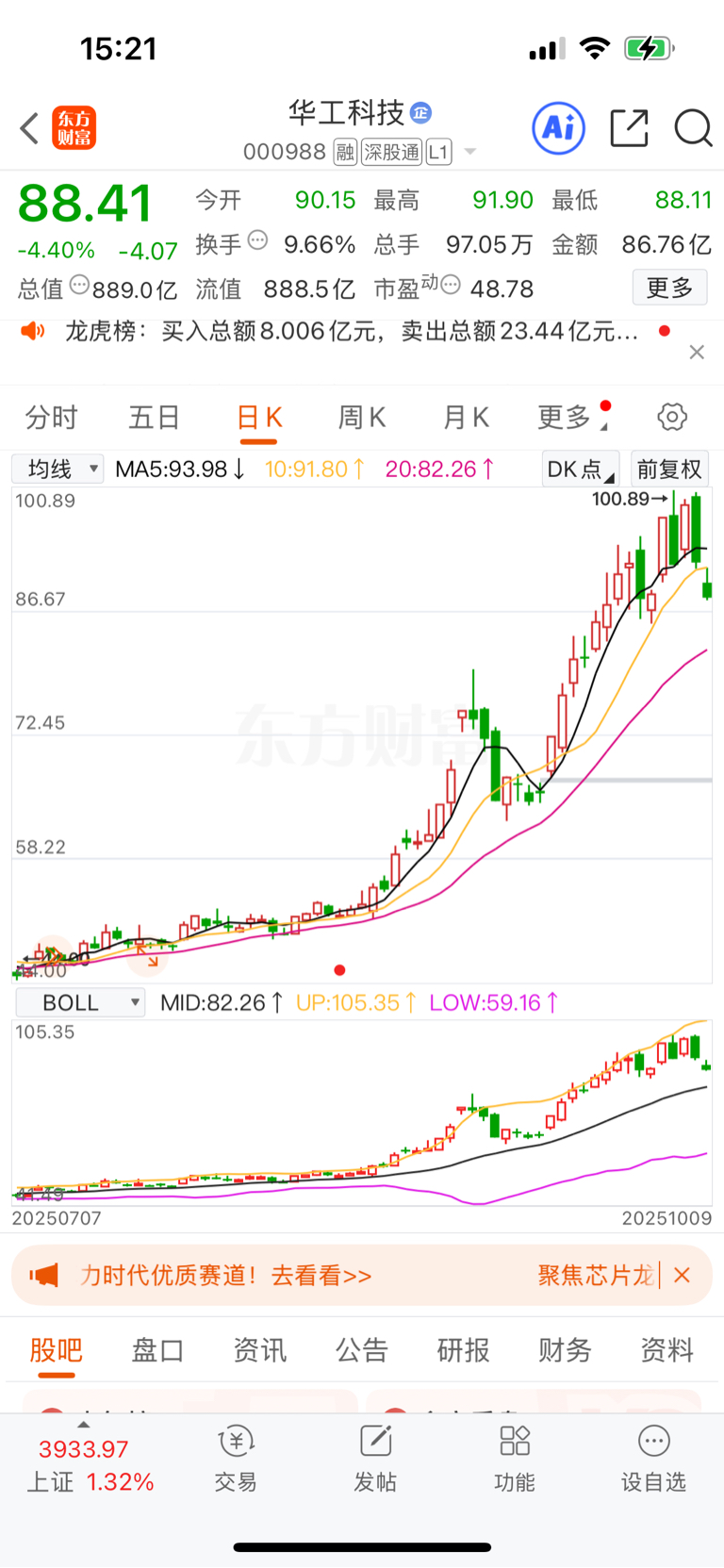 $华工科技(SZ000988)$ #收盘点评# 华工科技今天收盘跌破10日均线,股价会震荡下行至20日线83元附近找支撑