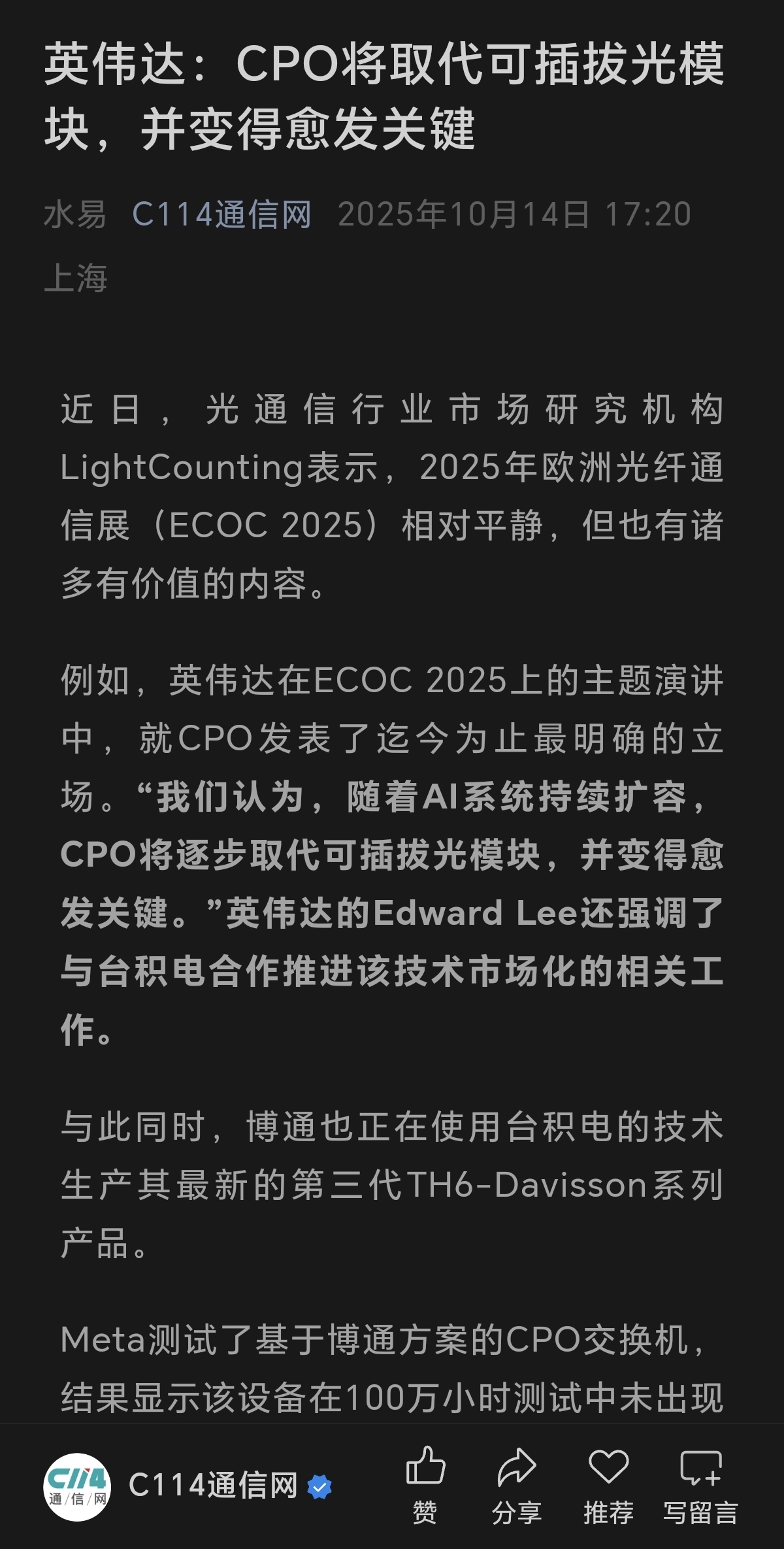 英伟达:CPO将取代可插拔光模块,并变得愈发关键