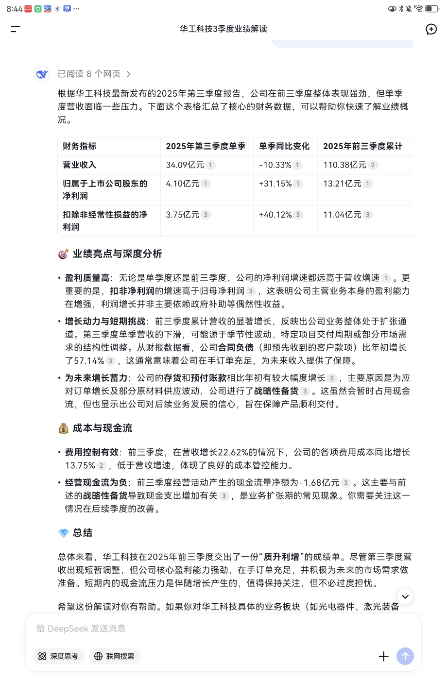 $华工科技(SZ000988)$ 看看deep seek解读一三季度报告