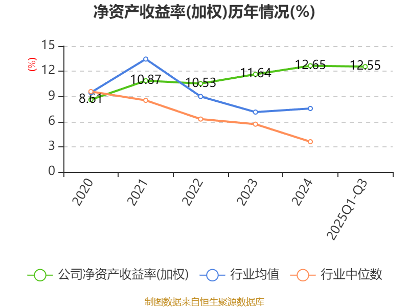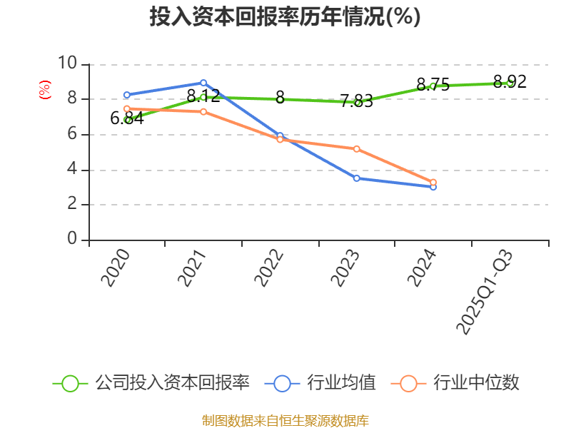 盈利能力方面, 2025年前三季度公司加权平均净资产收益率为12.55%,同比上升2.69个百分点。公司2025年前三季度投入资本回报率为8.92%,较上年同期上升1.99个百分点。