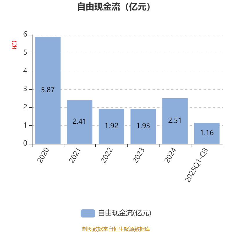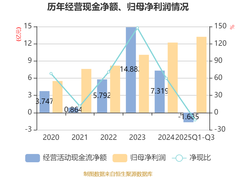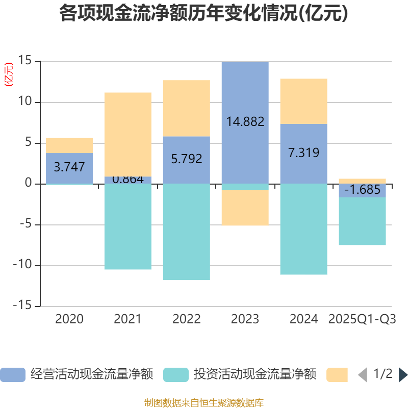 2025年前三季度,公司经营活动现金流净额为-1.68亿元,同比增加6609.97万元;筹资活动现金流净额5953.55万元,同比减少4.78亿元;投资活动现金流净额-5.85亿元,上年同期为-10.59亿元。