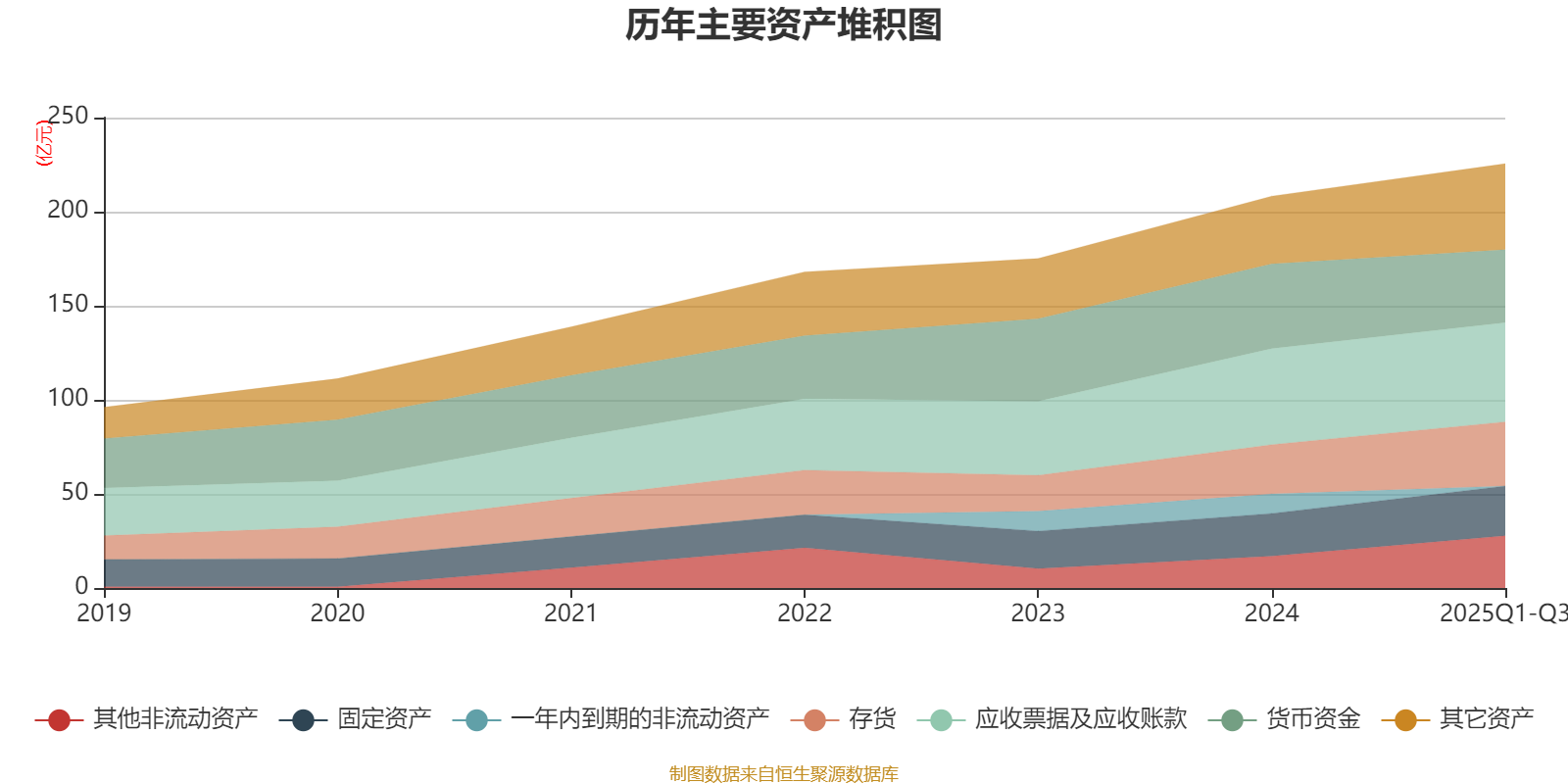 资产重大变化方面,截至2025年三季度末,公司一年内到期的非流动资产较上年末减少100%,占公司总资产比重下降4.98个百分点;货币资金较上年末减少13.82%,占公司总资产比重下降4.42个百分点;其他非流动资产较上年末增加64.4%,占公司总资产比重上升4.2个百分点;存货较上年末增加30.26%,占公司总资产比重上升2.55个百分点。