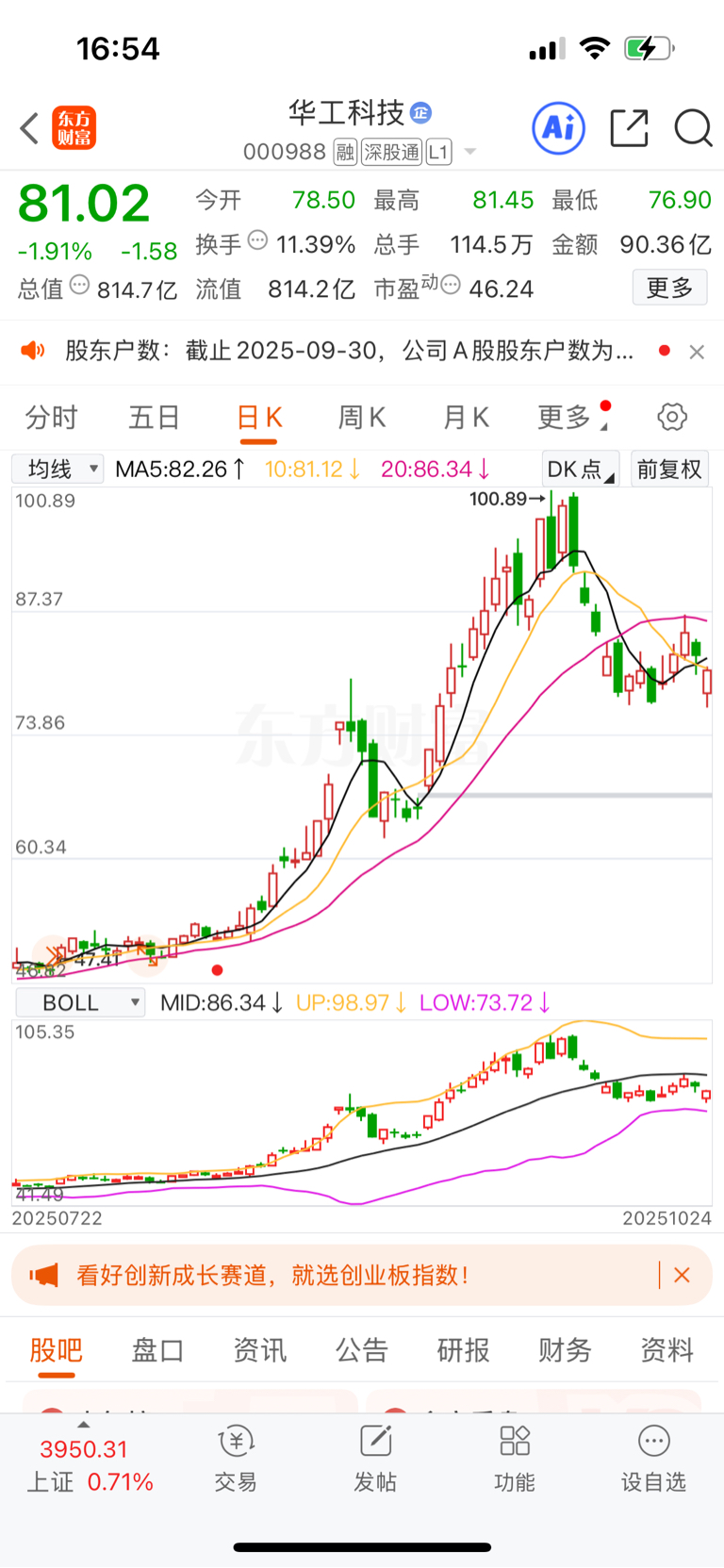 $华工科技(SZ000988)$ #收盘点评# 华工科技下一目标价格,布林线下轨支撑73.5元左右