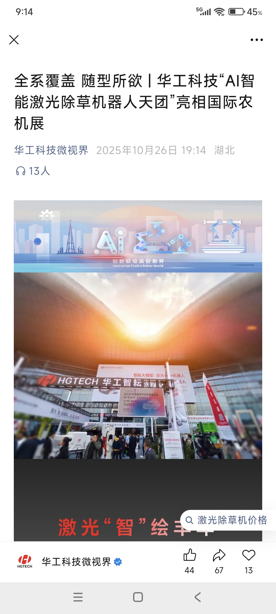 $华工科技(SZ000988)$ 大家说说华工科技全资子公司华工智耘激光除草机器人上市,市场空间多大?普通农户估计没戏,成本太高。追求绿色有机食品的农场估计是标配吧,可以完全消除除草剂的对健康影响。