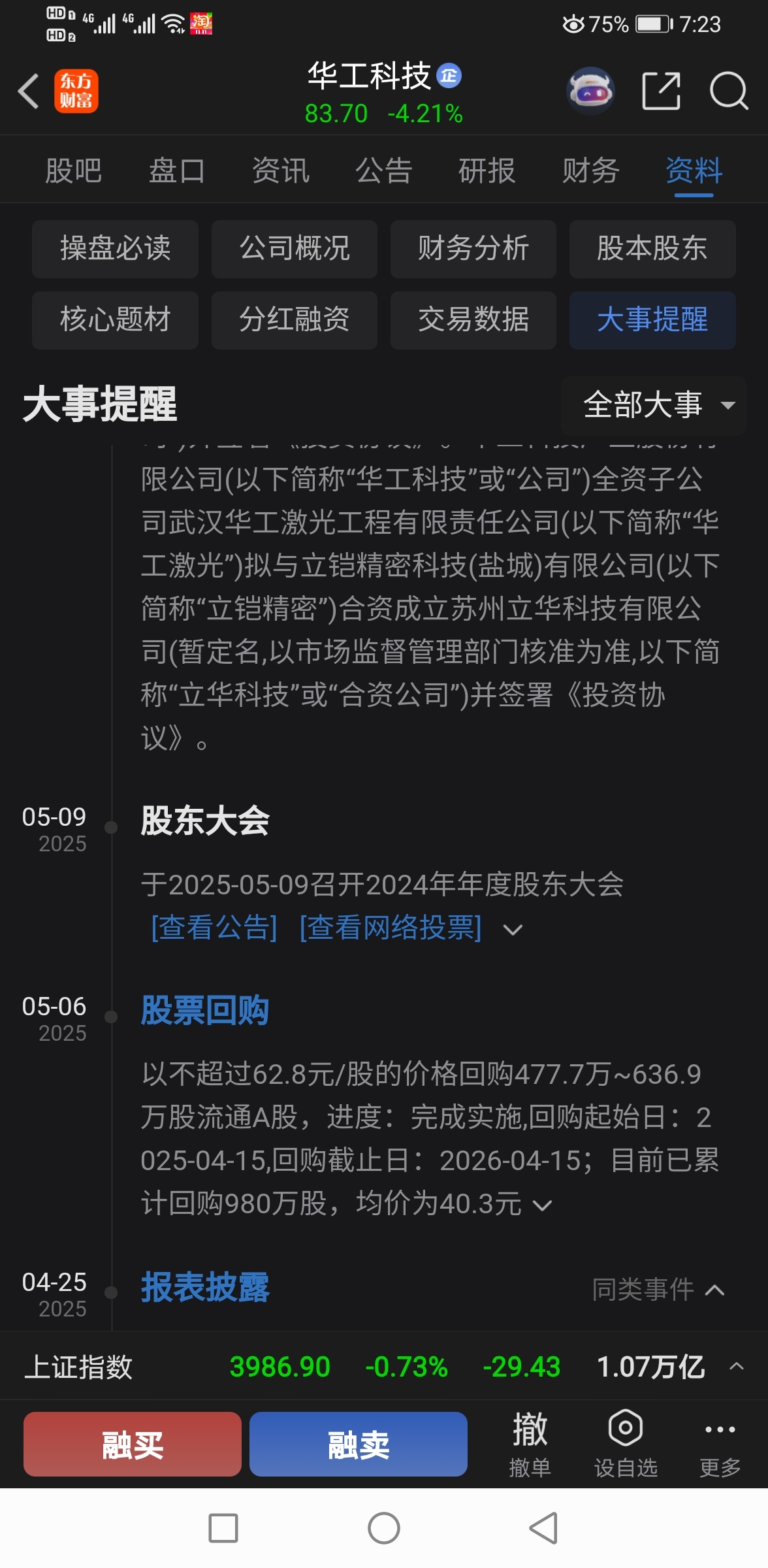 $华工科技(SZ000988)$ 华工科技短期暴涨已积累大量获利盘,从趋势图和量能分析近期应该有一较大幅度的调整。