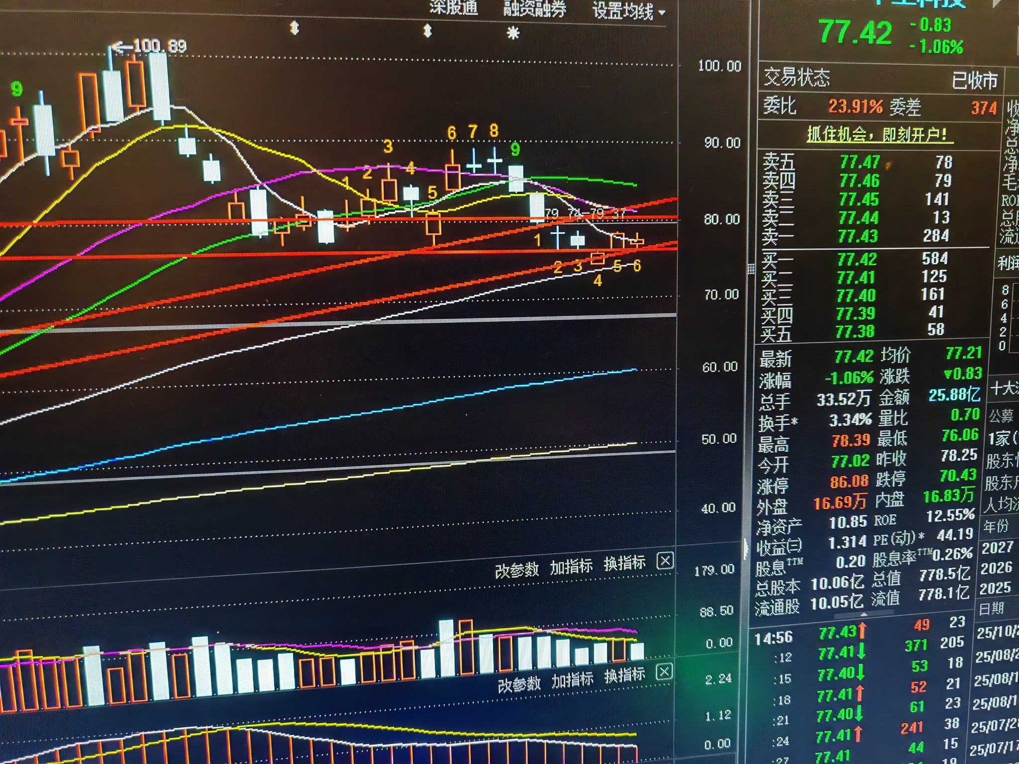 $华工科技(SZ000988)$ 图画出来,对当前形式做一下客观分析。从图中清晰可见,11月3号到今天收盘一直维持在上有压力和下有支撑的极小空间箱体震荡(5号破位,但收盘有收回来)接下来如果再次有效跌破支撑位,就看68元附近支撑。而如果站稳80,并且放量站上83,就会重回90元上方。个人观点:本周空头还是占优势,不断发起猛烈进攻,而多头还是采取防御态势,没能发起有效进攻,多头防线岌岌可危。