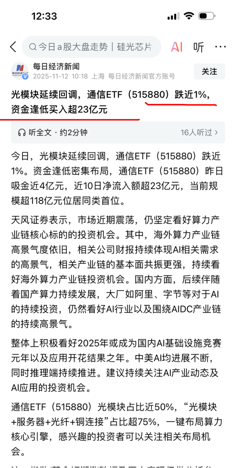 今日光模块延续回调,资金逢低密集布局通信etf,通信ETF昨日吸金近4亿元,近1