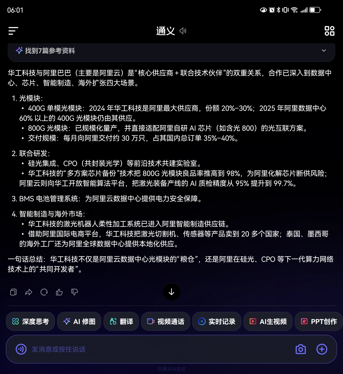 $华工科技(SZ000988)$ 说阿里启动通义千问,全面对比ChatGPT,带动港股科技起飞,问通义千问,通义千问自己说的,你们看看