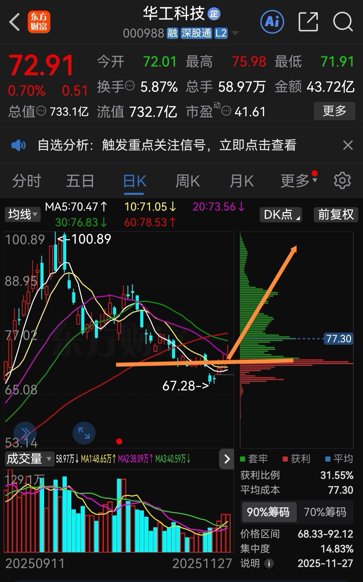 $华工科技(SZ000988)$ 底部73左右,慢慢磨,待积蓄力量,射击之星。这个位置大跌就加仓,就和上周五一样,还是可以吃肉的。不过大跌概率很小,除非和上周五一样大盘也狂跌2个点!$中际旭创(SZ300308)$ $剑桥科技(SH603083)$