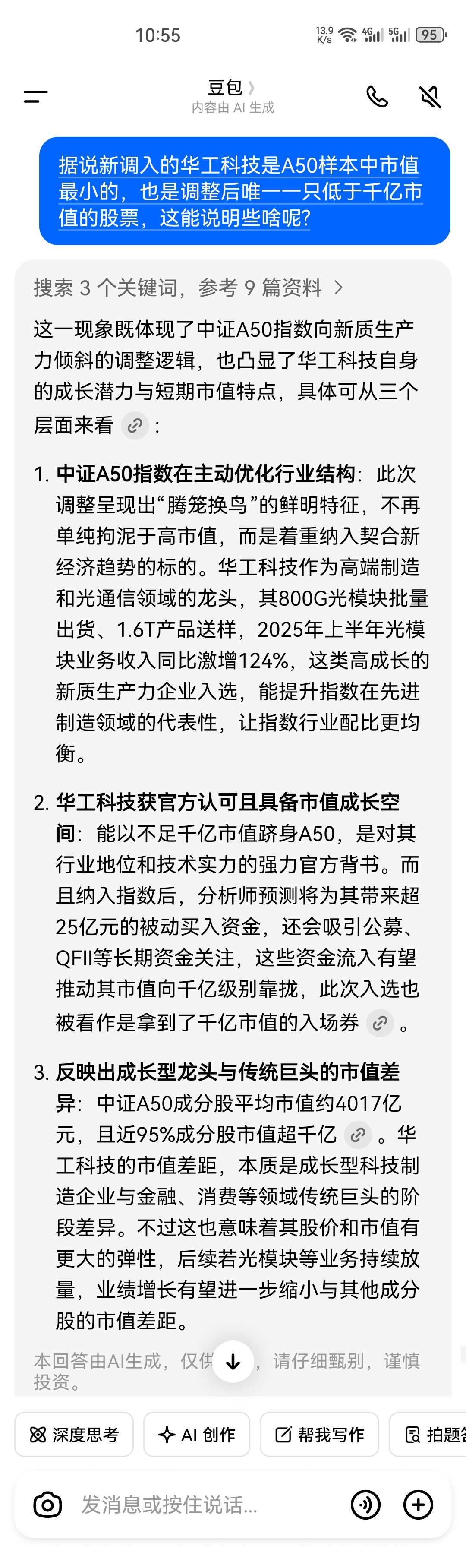 $华工科技(SZ000988)$ 据说新调入的华工科技是A50样本中市值最小的,也是调整后唯一一只低于千亿市值的股票,这能说明些啥呢?