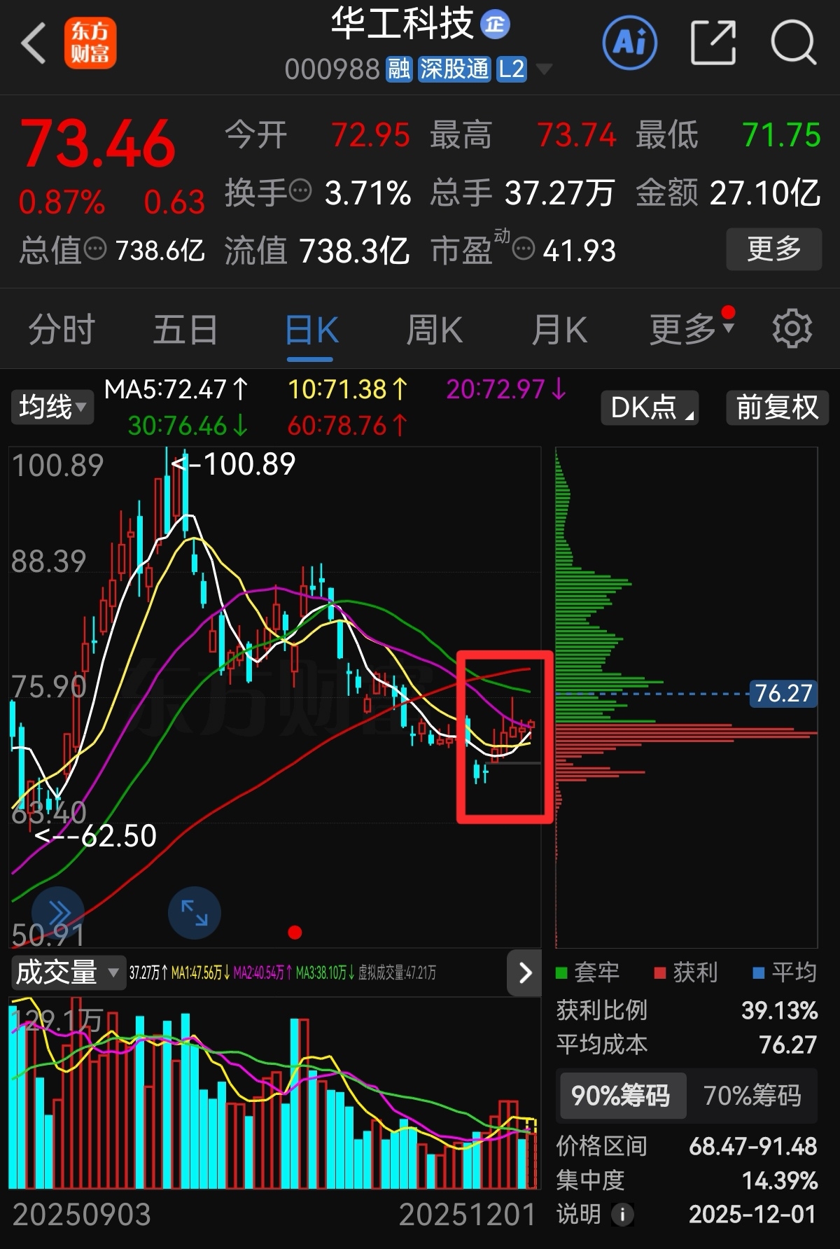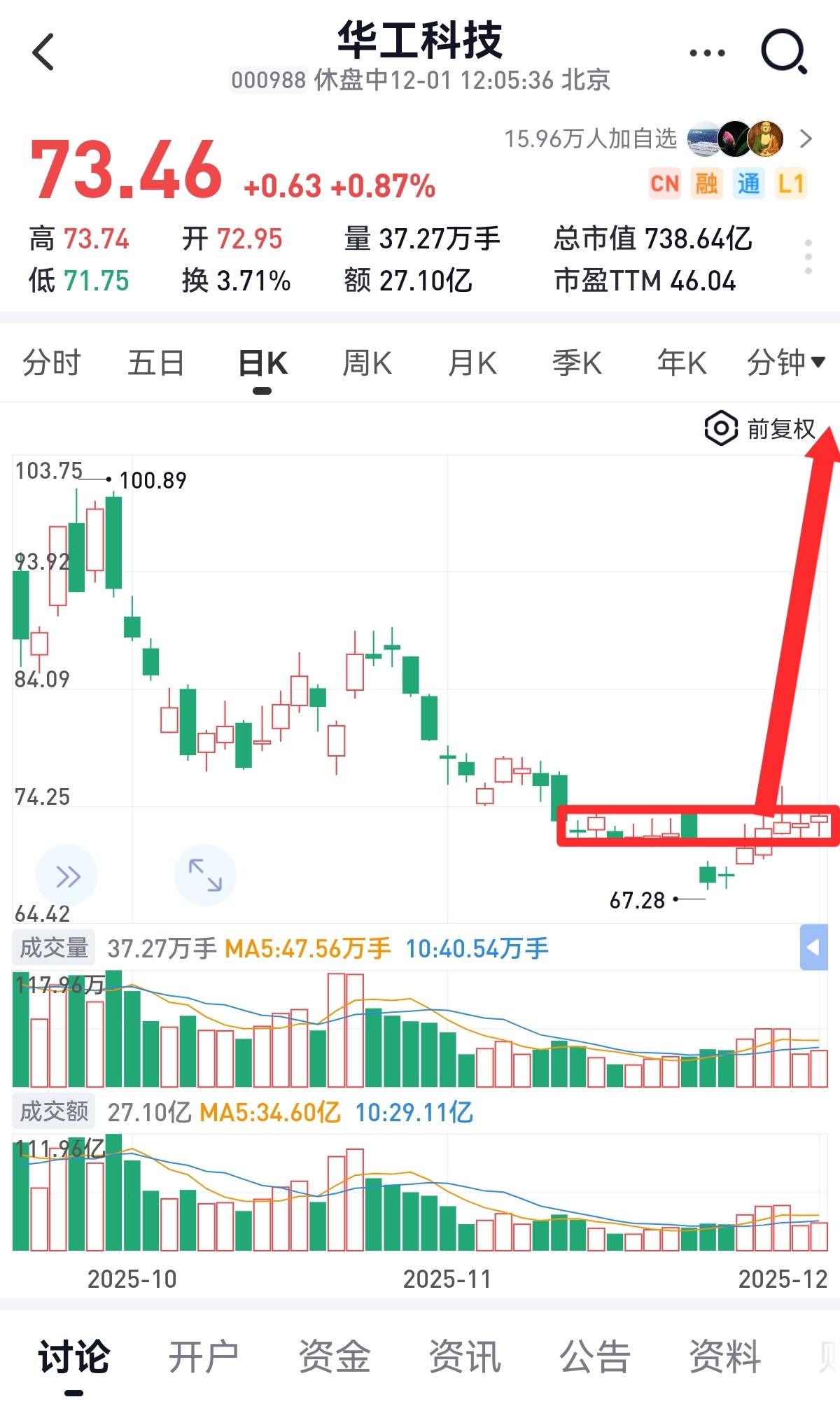 $华工科技(SZ000988)$ 华工,103跌到73,磨底20天了!再洗已没意义了!底部金叉已经形成!又进入中证A50,随时起飞!多向中际旭创榜样看齐,中际是华工市值的近10倍!空间潜力巨大!让子弹飞一会!$中际旭创(SZ300308)$ $光启技术(SZ002625)$ ,