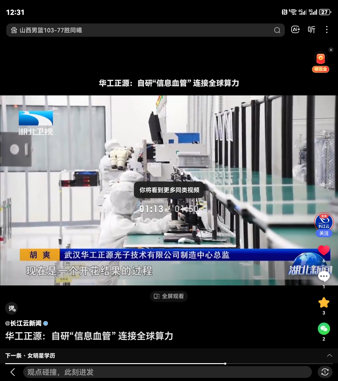 $华工科技(SZ000988)$ 湖北卫视24日晚上报导华工科技1.6T光模块批量下线
