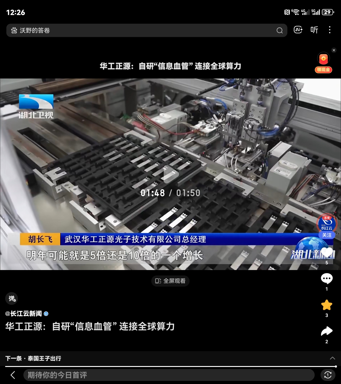 $华工科技(SZ000988)$ 湖北卫视24日晚上报导1.6T光模块批量生产下线,明年会5倍到10倍的增长,现在是一个开花结果的过程。