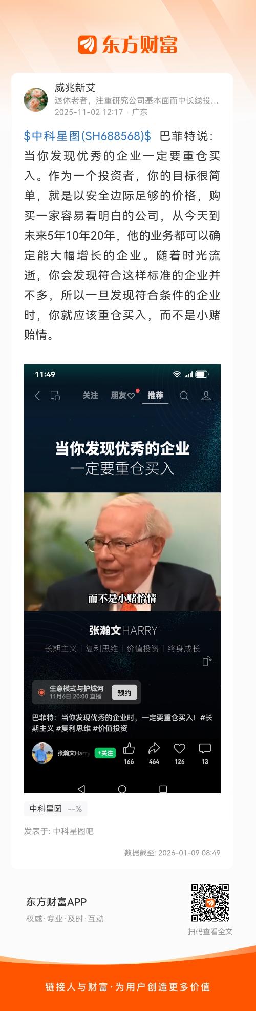 $中科星图(SH688568)$ 巴菲特说:当你发现优秀的企业一定要重仓买入。作为一个投资者,你的目标很简单,就是以安全边际足够的价格,购买一家容易看明白的公司,从今天到未来5年10年20年,他的业务都可以确定能大幅增长的企业。随着时光流逝,你会发现符合这样标准的企业并不多,所以一旦发现符合条件的企业时,你就应该重仓买入,而不是小赌贻情。