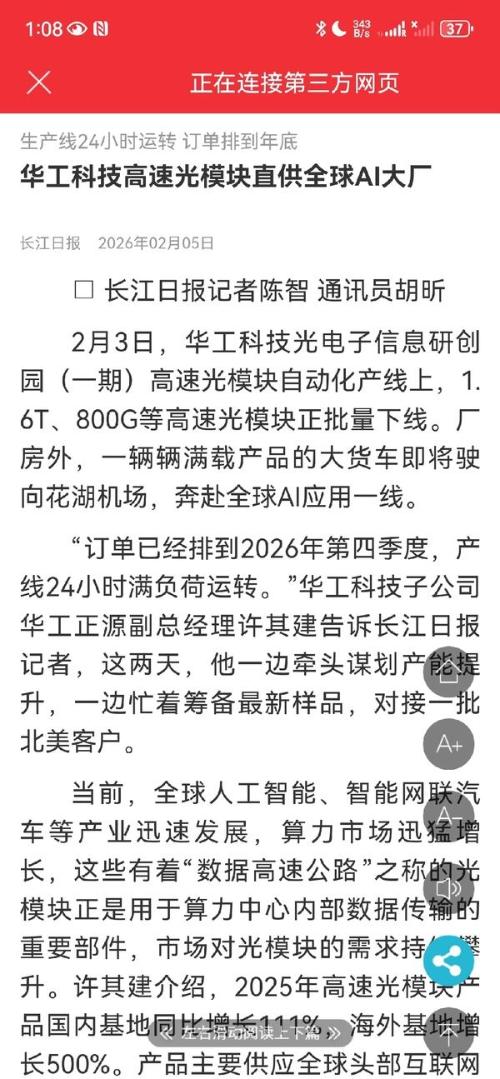 “订单已经排到2026年第四季度,产线24小时满负荷运转。”华工科技子公司华工正源副总经理许其建告诉长江日报记者,这两天,他一边牵头谋划产能提升,一边忙着筹备最新样品,对接一批北美客户。