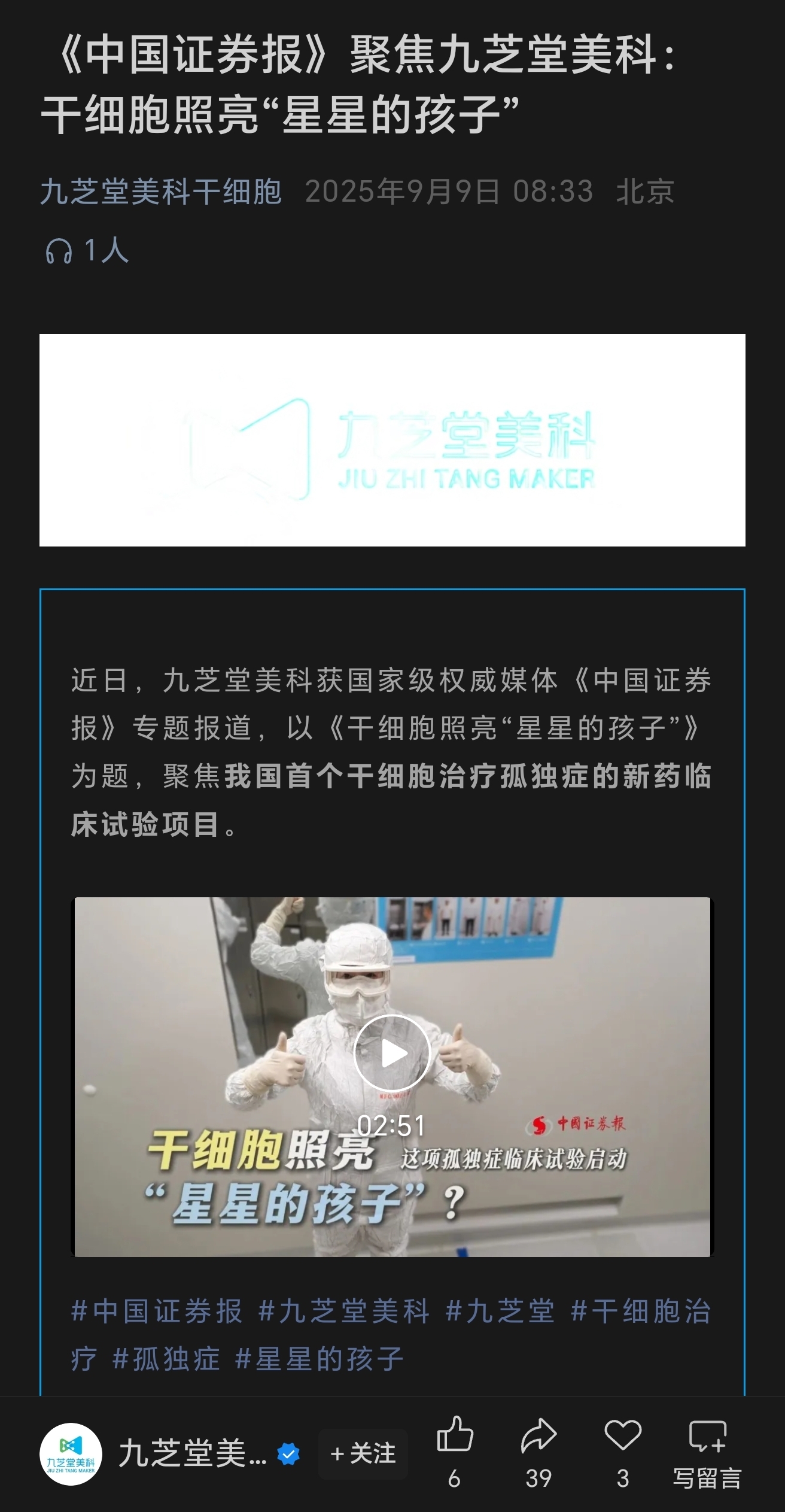干细胞疗法讨论度上升近日,九芝堂美科获国家级权威媒体《中国证券报》专题报道,以《