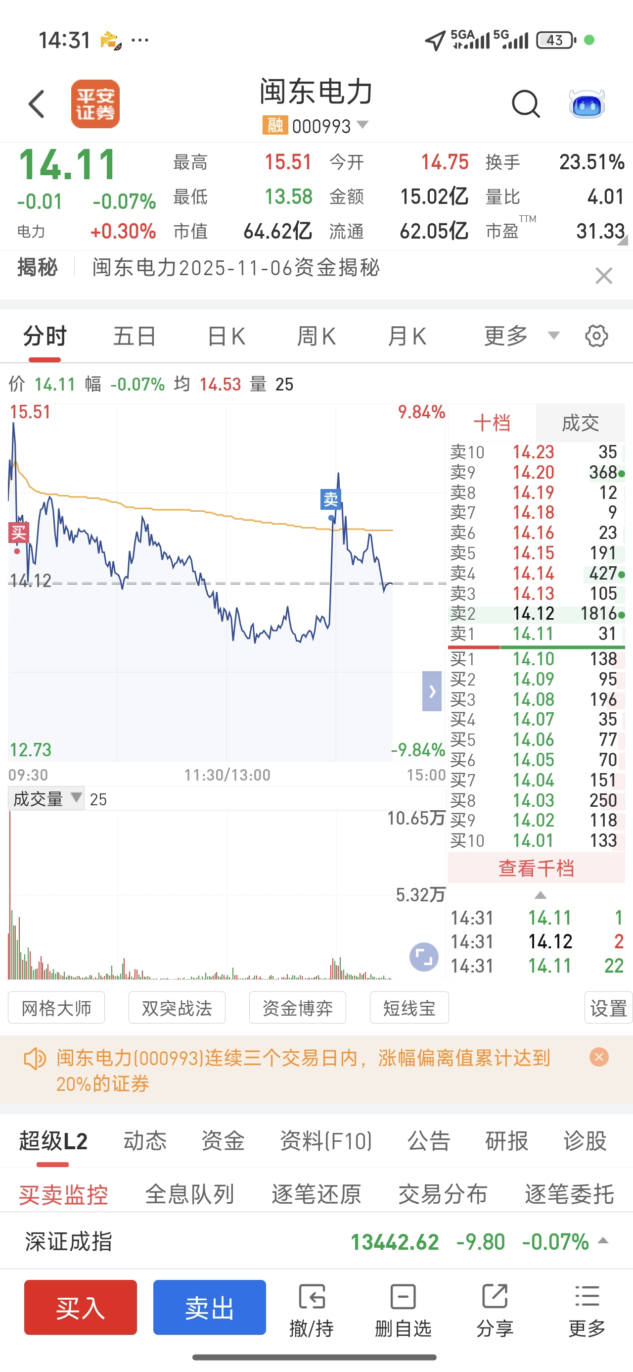 $闽东电力(SZ000993)$ 四个点卖了,卖早了点