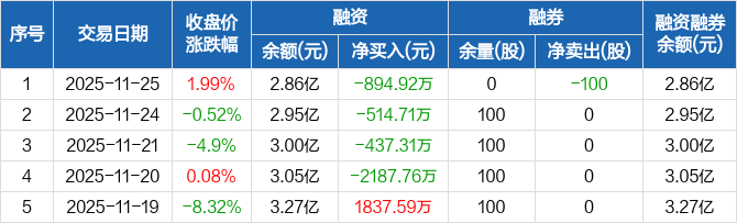 融资方面,当日融资买入3366.11万元,融资偿还4261.03万元,融资净偿还894.92万元,连续4日净偿还累计4034.71万元。融券方面,融券卖出0股,融券偿还100股,融券余量0股,融券余额0元。融资融券余额合计2.86亿元。
