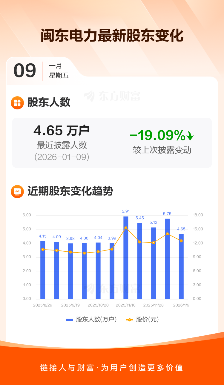 闽东电力:截至1月9日最新股东户数4.65万户,较上期减少19.09%