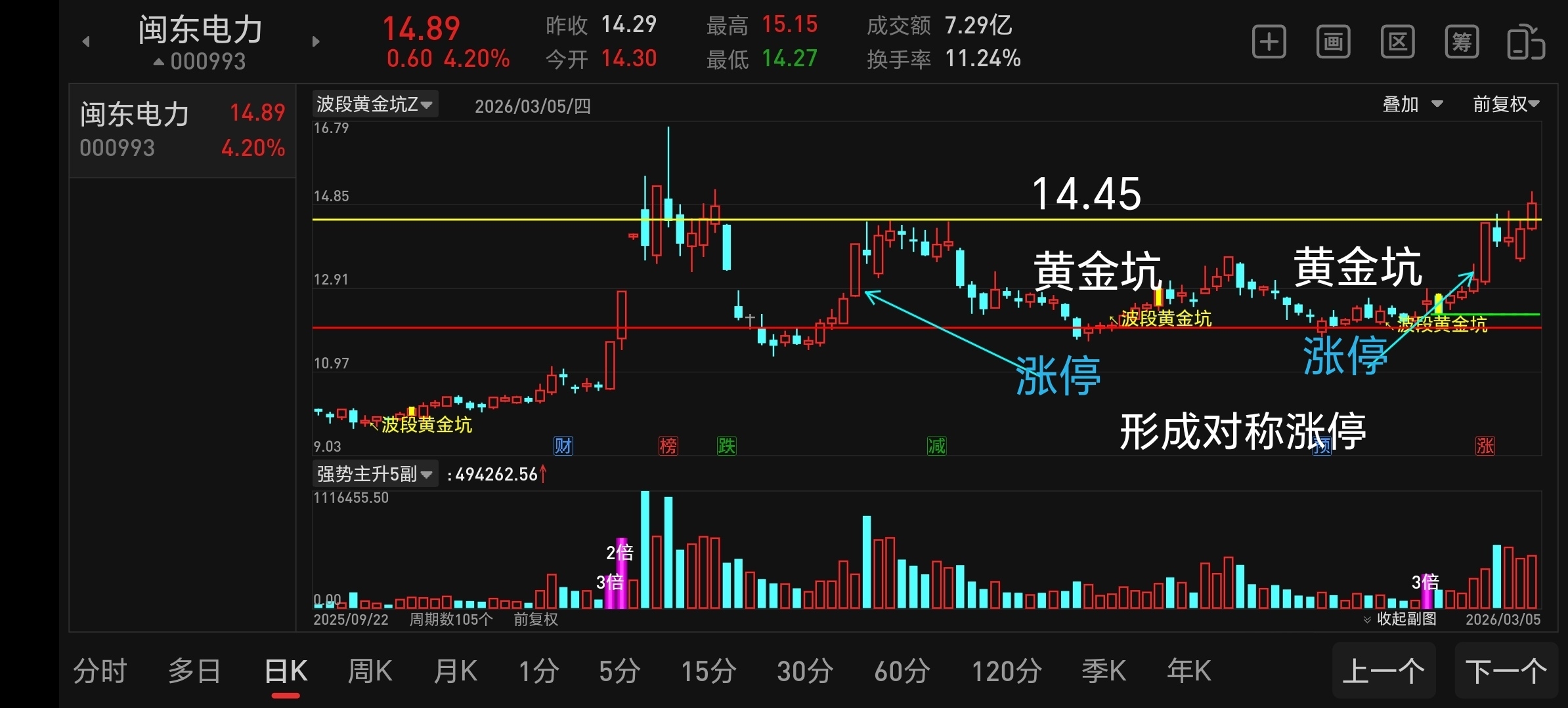 $闽东电力(SZ000993)$ 今日建仓闽东,闽东前期挖了两个黄金坑,今日已经放量突破颈线位14.45,主力已经高度控盘, 准备迎接大肉!记录个人投资历程,个人观点不构成操作建议!