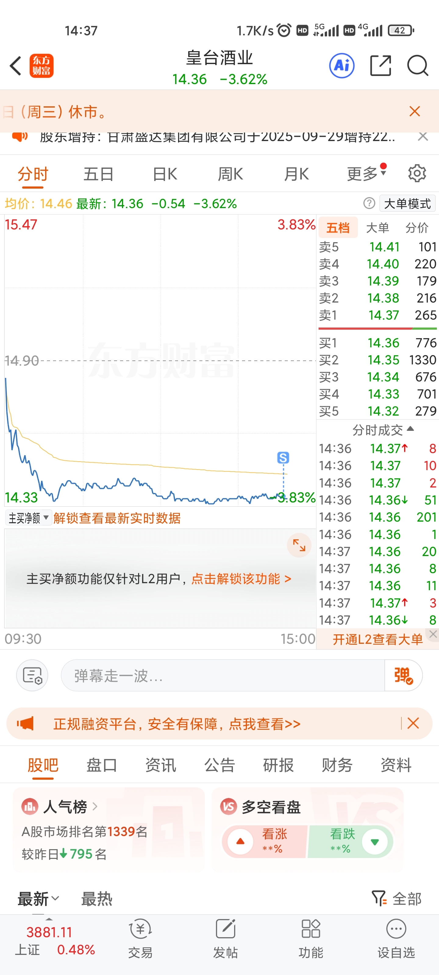 $皇台酒业(SZ000995)$ 昨天尾盘进的,割了兄弟你,留下的9号发财