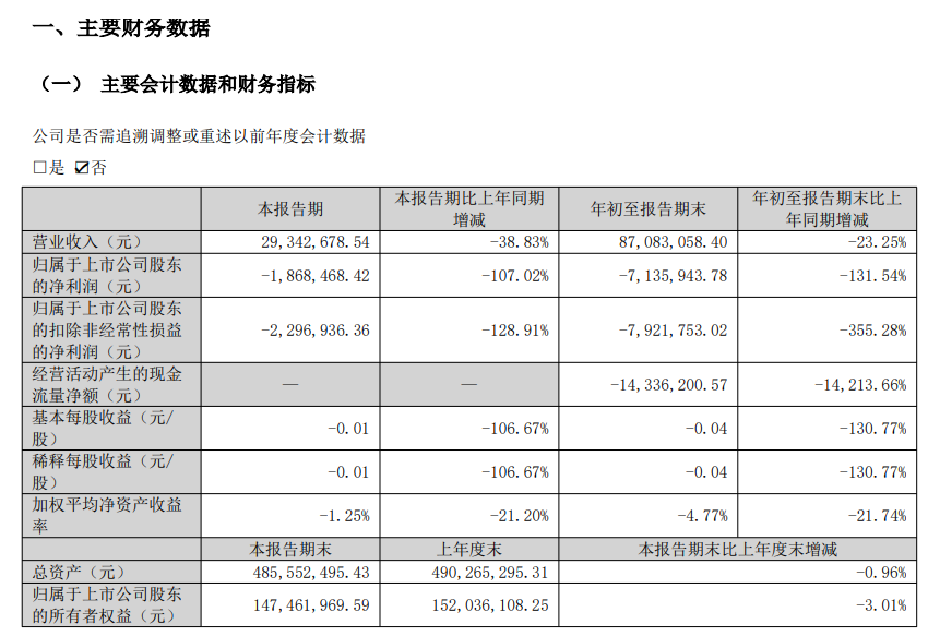 其中第三季度,公司营业收入为2934万元,同比下降38.83%;归母净利润亏损187万元,同比下降107.02%;扣非归母净利润亏损230万元,同比下降128.91%。