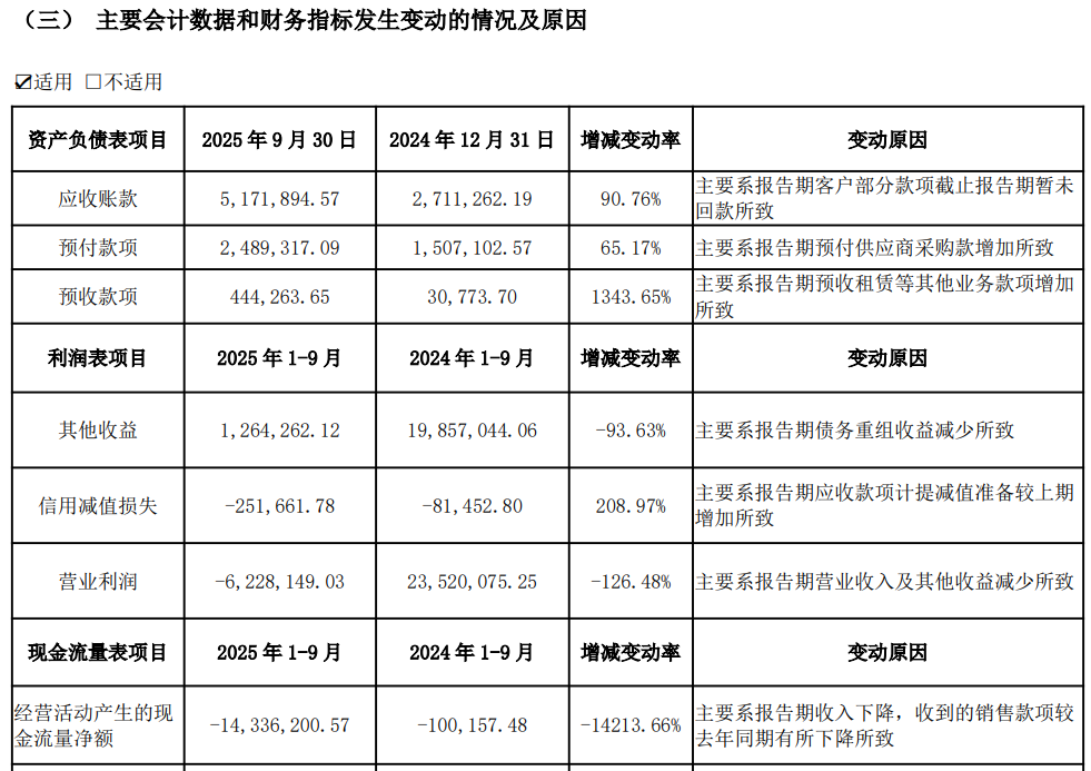 三季报显示,公司前三季营业利润下跌126.48%,主要系报告期营业收入及其他收益减少所致;应收账款大增90.76%,主要系报告期客户部分款项截止报告期暂未回款所致;信用减值损失大增208.97%,主要系报告期应收款项计提减值准备较上期增加所致;经营活动产生的现金流量净额同比大减14213.66%,主要系报告期收入下降,收到的销售款项较去年同期有所下降所致。