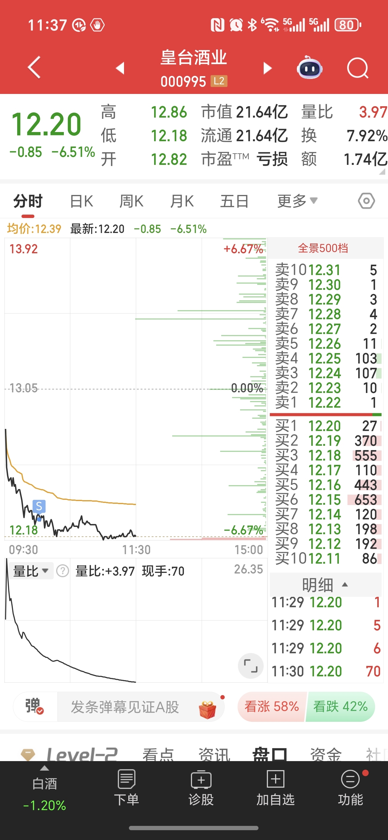$皇台酒业(SZ000995)$ 昨天打板进的,已经吐血了。