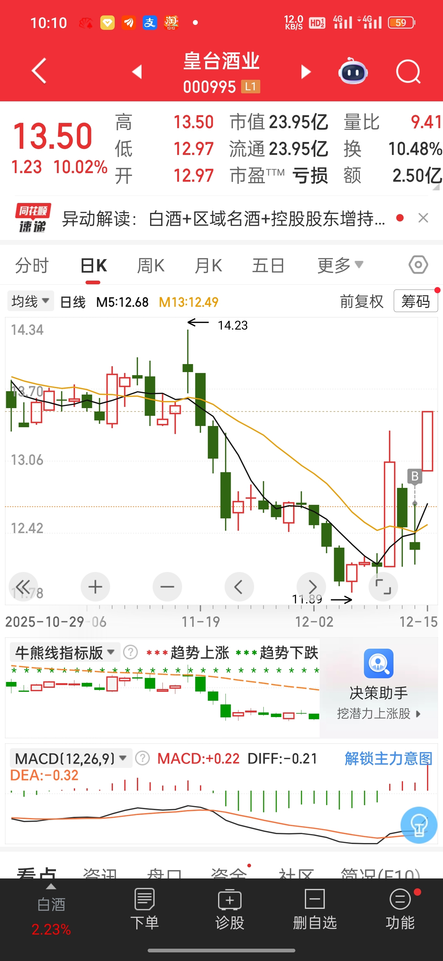 上周看着皇台有异动,追高进了一把,收盘浮亏4个点,原本以为今天要吃面了,没想到茅