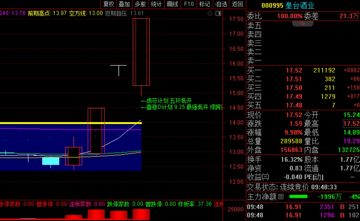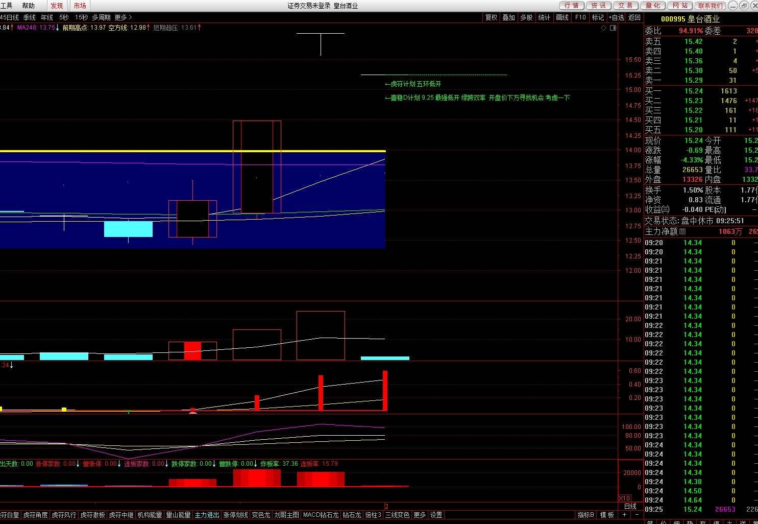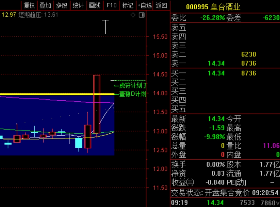 皇台酒业在开盘价以下到跌停板附近埋伏,注意跌停板不封死才可以入