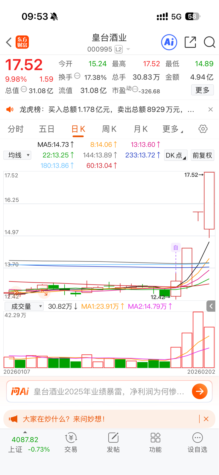 $皇台酒业(SZ000995)$ 重仓被套5个点没舍得换