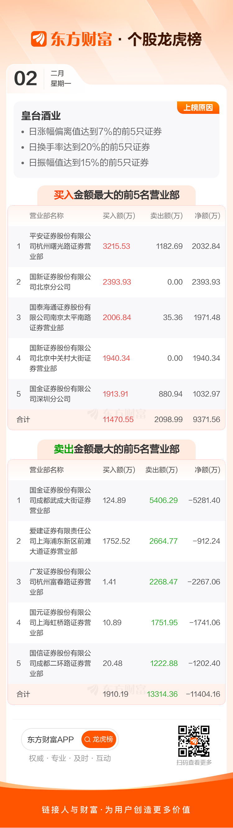 交易所2026年2月2日公布的交易公开信息显示,皇台酒业因成为日换手率达到20%的前5只证券、日涨幅偏离值达到7%的前5只证券、日振幅值达到15%的前5只证券上榜。皇台酒业当日收报17.52元,涨跌幅9.98%,偏离值35.40%,换手率35.40%,成交额10.50亿。