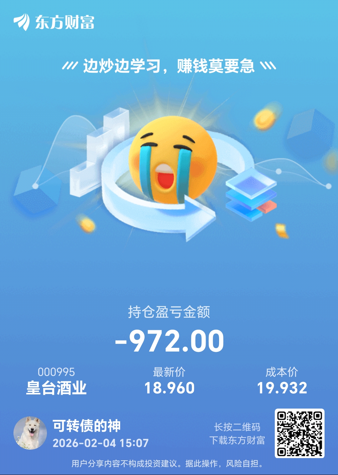 温馨提示: 1.根据《证券法》规定,禁止编造、传播虚假信息或者误导性信息,扰乱证券市场;2.用户在本社区发表的所有资料、言论等仅代表个人观点,与本网站立场无关,不对您构成任何投资建议。用户应基于自己的独立判断,自行决定证券投资并承担相应风险。《东方财富社区管理规定》