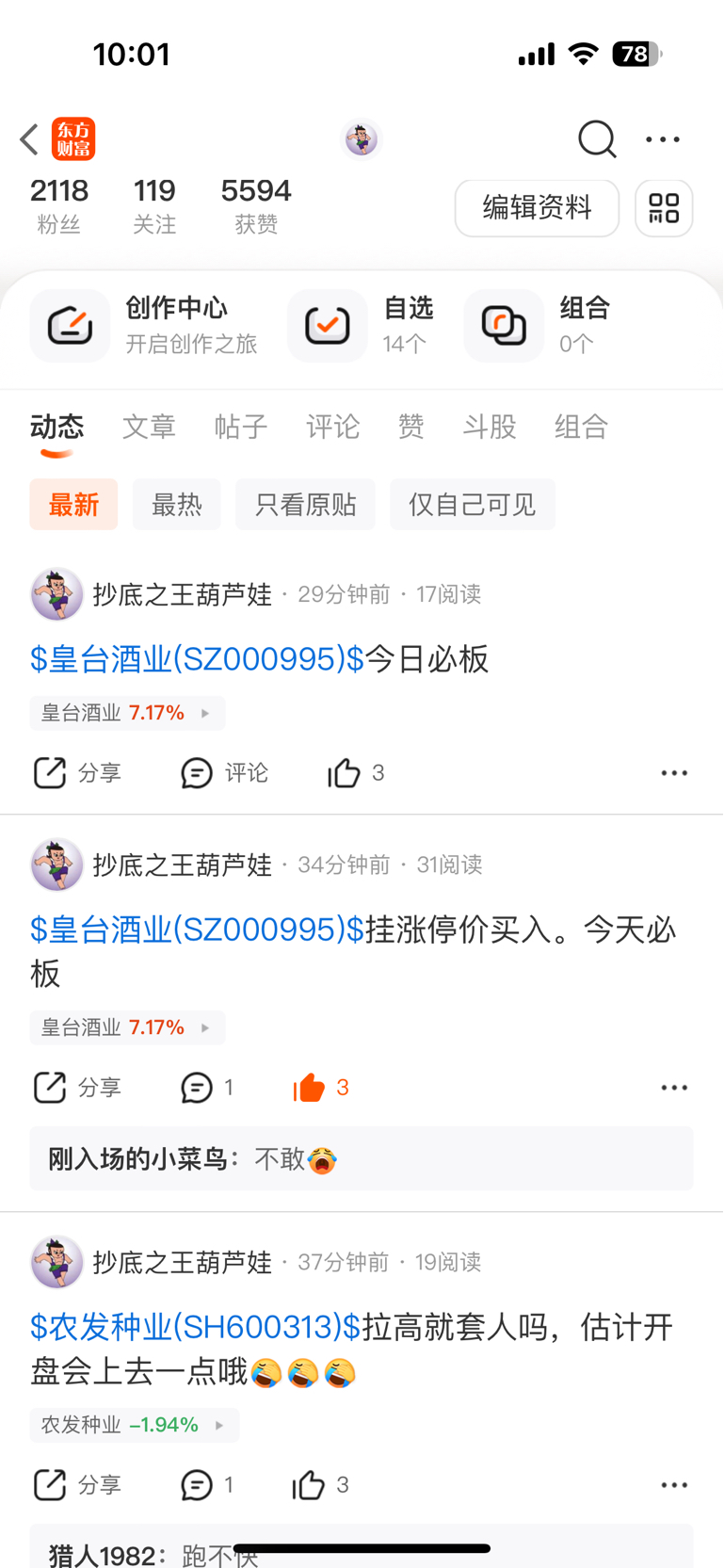 $皇台酒业(SZ000995)$ 关注我,每天通知股票买卖交易点,看好的和不看好的票,我都会发帖,有