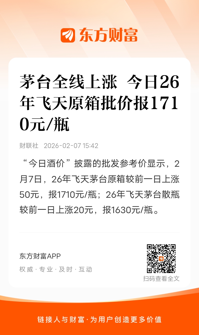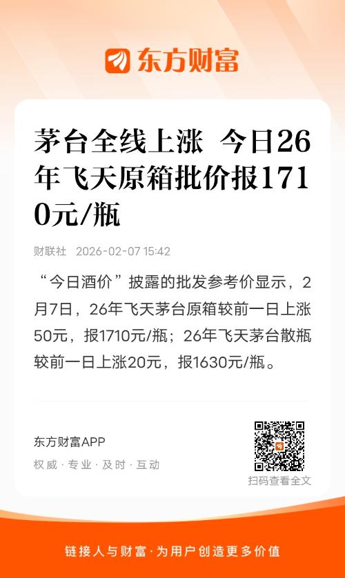 “今日酒价”披露的批发参考价显示,2月7日,26年飞天茅台原箱较前一日上涨50元,报1710元/瓶;26年飞天茅台散瓶较前一日上涨20元,报1630元/瓶。25年飞天茅台原箱较前一日上涨70元,报1740元/瓶;25年飞天茅台散瓶较前一日上涨20元,报1640元/瓶。24年飞天茅台原箱较前一日持平,报1780元/瓶;24年飞天茅台散瓶较前一日上涨30元,报1730元/瓶。