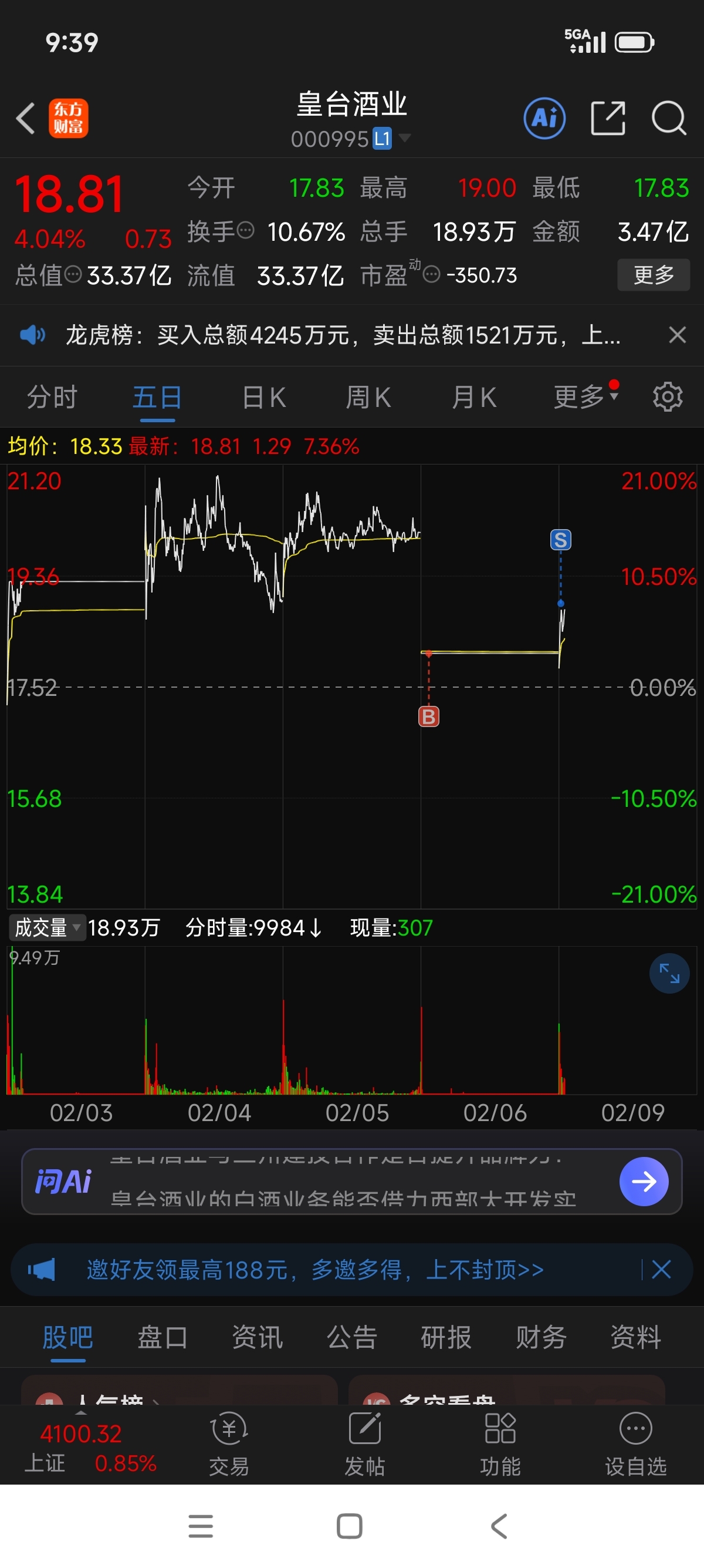 $皇台酒业(SZ000995)$ 一日游,见好就收5个点