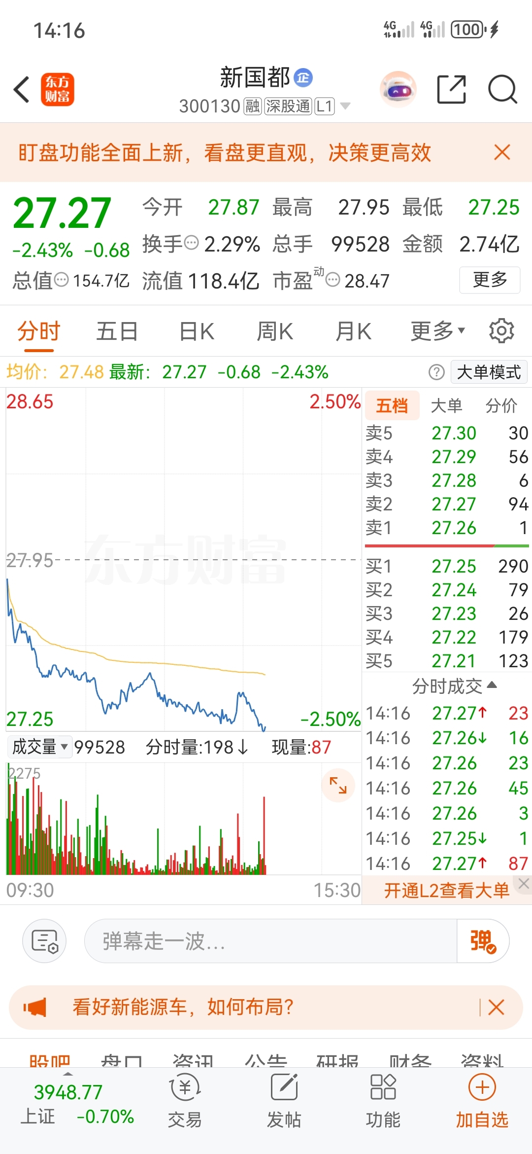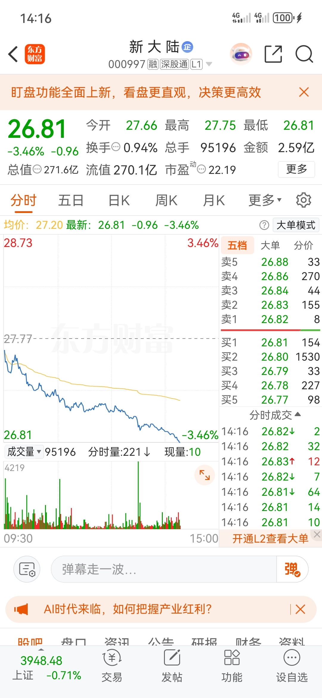 $新 大 陆(SZ000997)$ 支付三剑客中其他两股虽然也是跌,但人家是下跌反弹在下跌在反弹,而你到好一直45度斜线下杀不带一点反弹,迭创盘中新底,唉无语